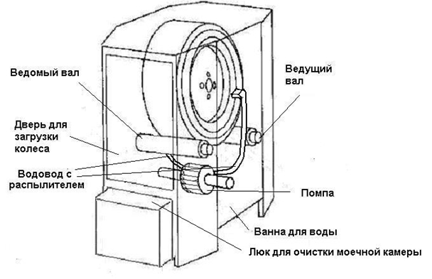 Мойка колес производится в три этапа:1. Колеса снимаются с автомобиля и по одному устанавливаются вертикально на роликовые опоры в установку.